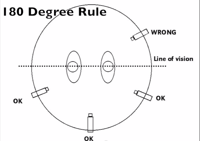 When the camera passes over the invisible axis connecting the two subjects, it is called crossing the line and the shot becomes what is called a reverse angle. Reversing the angle is commonly thought to be disorienting and can distract the audience from the intent of the scene.