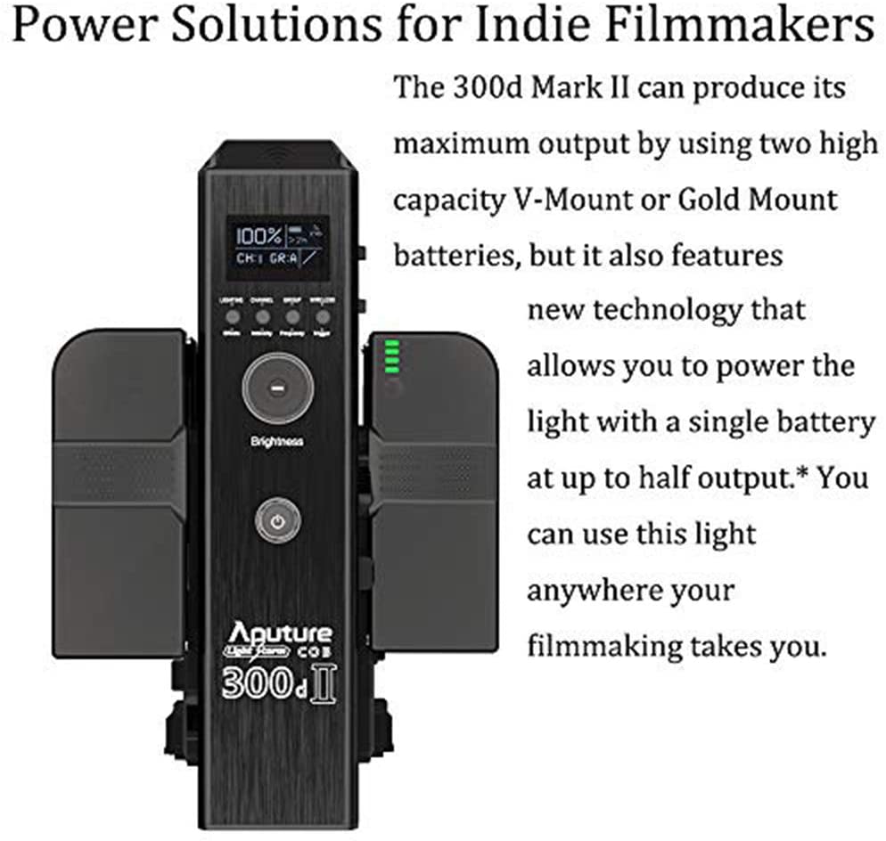 The 300d Mark II can produce its maximum output by using two high capacity V-Mount or Gold Mount batteries, but it also features new technology that allows you to power the light with a single battery at up to half output. You can use this light anywhere your filmmaking takes you.