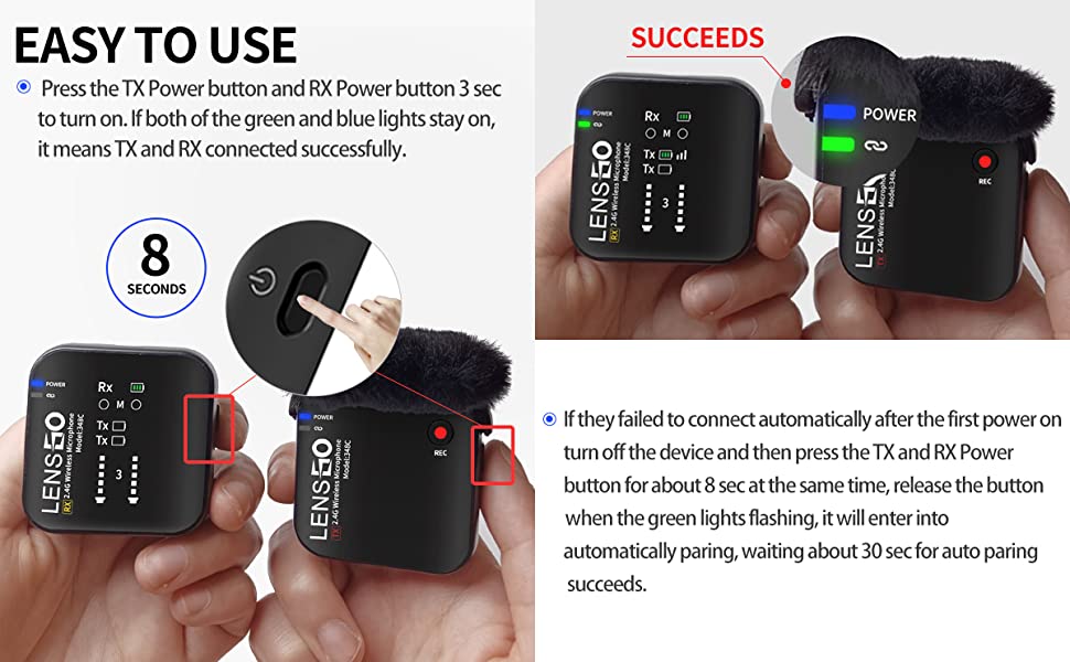 - TF Card Record & One Click Recording – LENSGO LWM-348C Wireless Lavalier Mic microphone with Built-in TF card slot, 32 GB Max Capacity. Record audio synchronously to prevent loss of recorded audio and save instantly. External REC recording button can realize one-key start/pause of the built-in card recording function.which can avoid some embarrassing situations effectively.